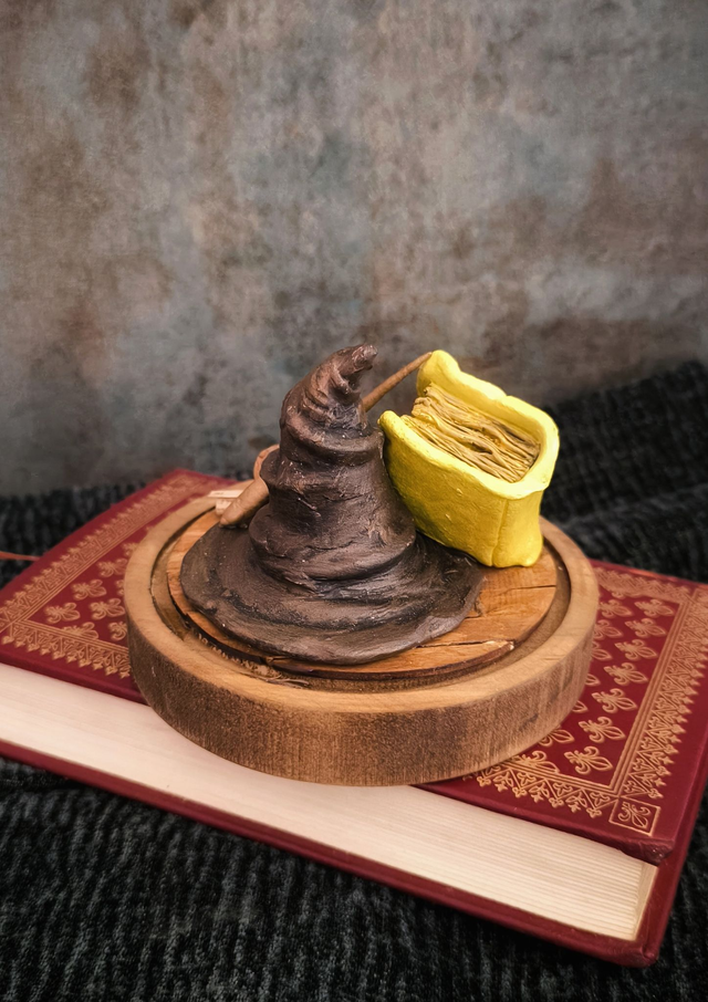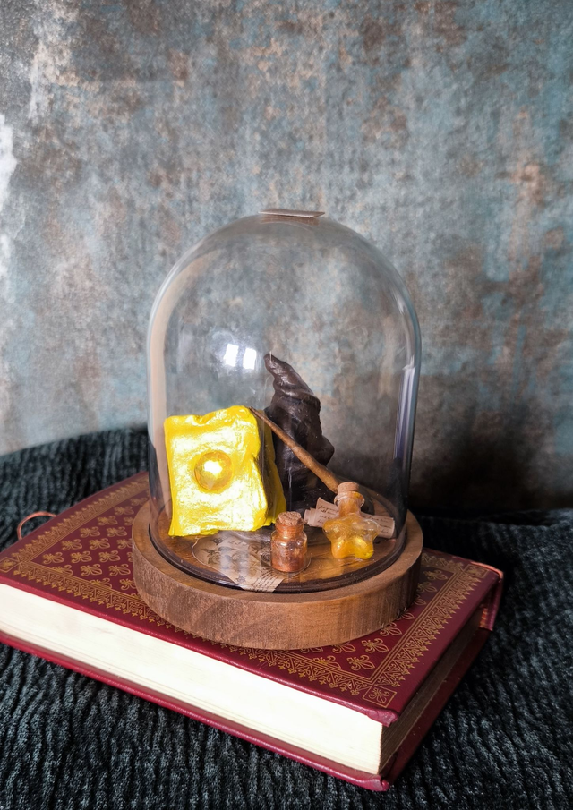 Chapeau, grimoire et baguette sont sculptés à la main en pâte polymère. Après cuisson, ils sont peints dans les teintes jaunes et marrons et intégrés dans un décor unique. Découvrez les petits détails, pensés pour émerveiller les esprits curieux.