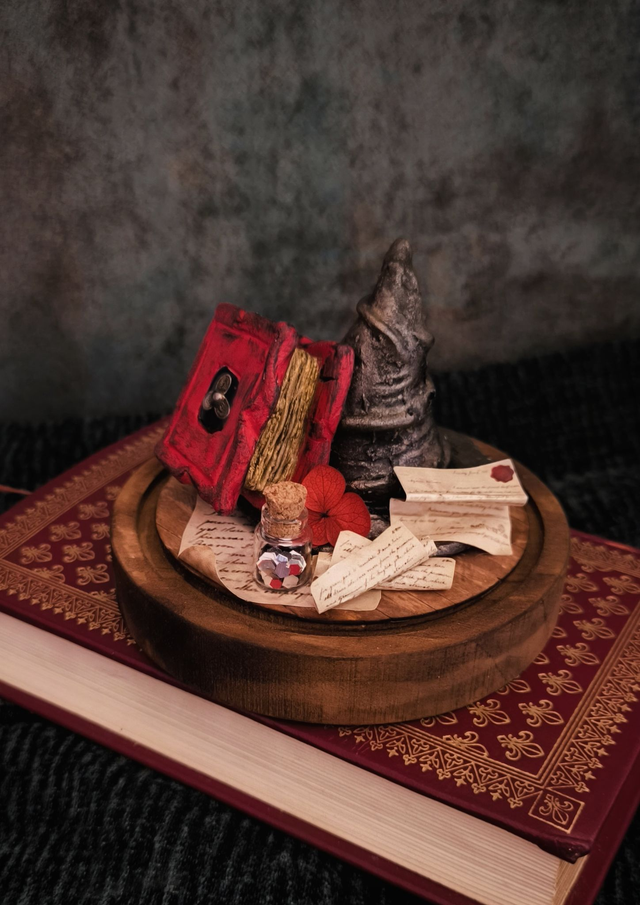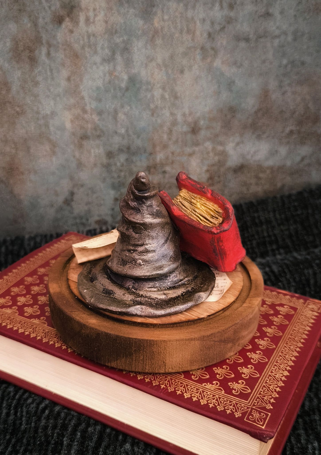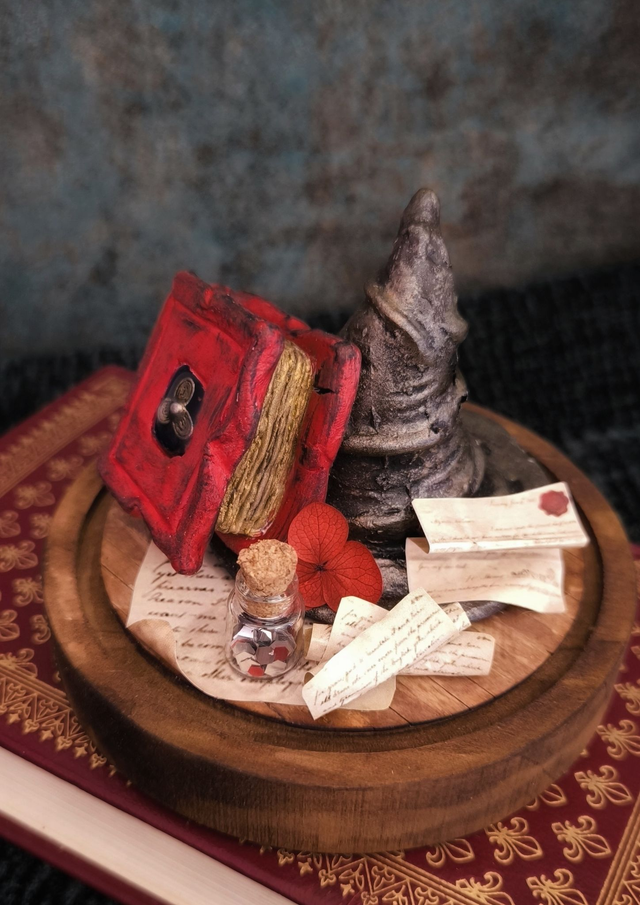 Le grimoire et le chapeau sont des sculptures uniques, façonnées en pâte polymère, puis cuites et peintes à la main avant d’être intégrées à leur décor. Chaque détail a été pensé avec patience et minutie.