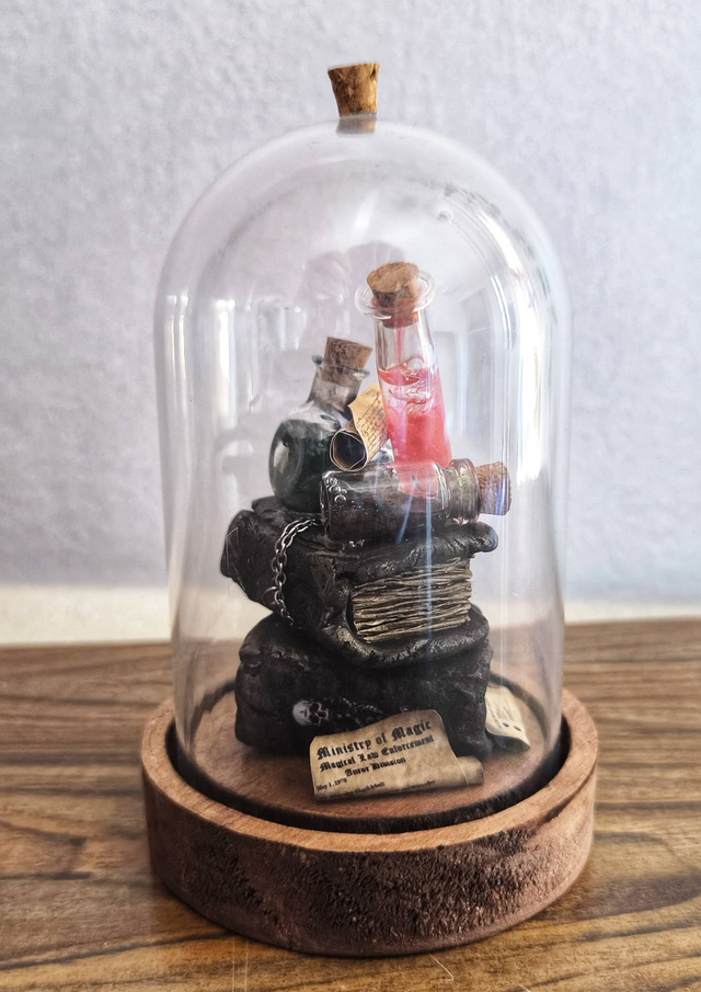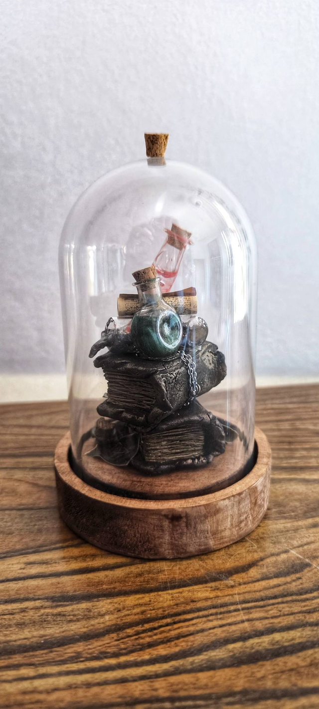 Les livres ont été sculptés à la main en pâte polymère avant d’être délicatement cuit, peint les tons noirs. Ce décor enchanteur est agrémenté d’une multitude de flacons de potion teintés rouge, noir, vert. La cloche est en plastique est légèrement fumé