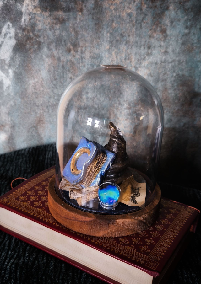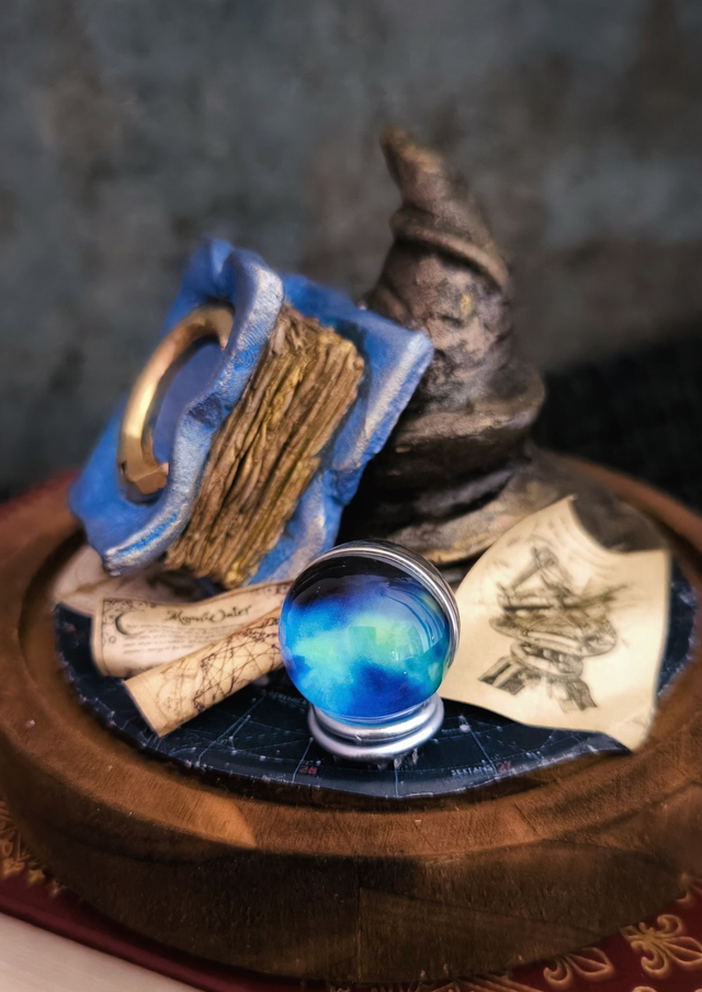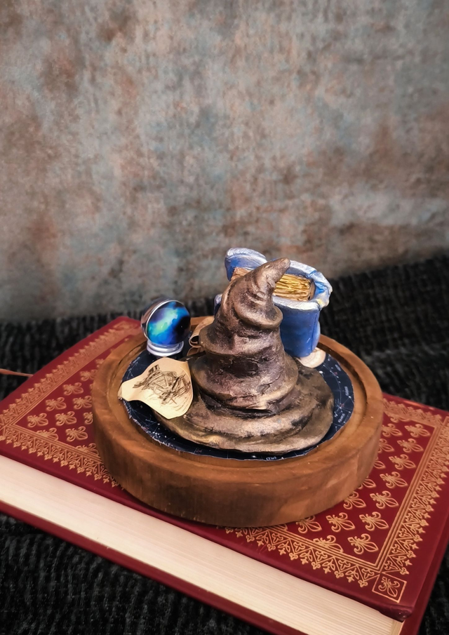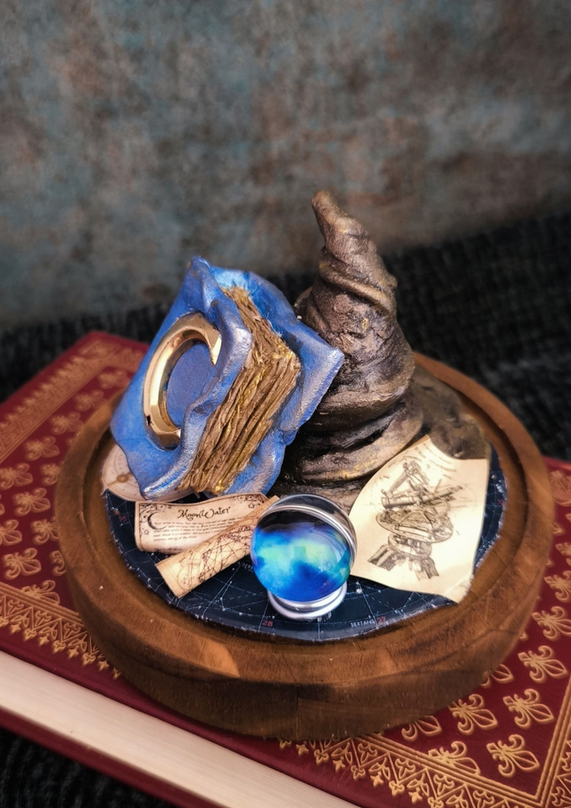 Chapeau et grimoire sont sculptés à la main en pâte polymère. Après cuisson, ils sont peints dans les teintes de bleu et marron puis intégrés dans un décor unique.