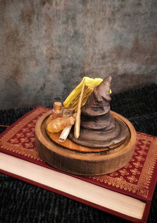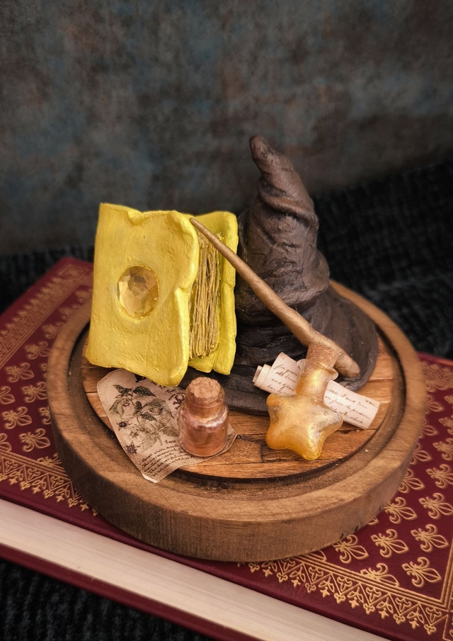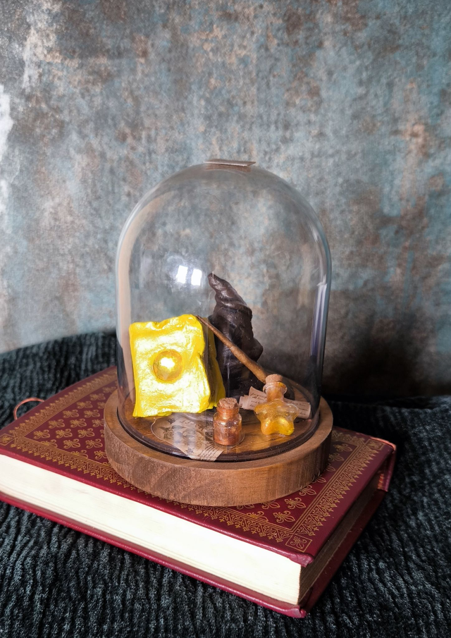 Le grimoire et le chapeau sont des sculptures uniques, façonnées en pâte polymère, puis cuites et peintes à la main avant d’être intégrées à leur décor. Chaque détail a été pensé avec patience et minutie.