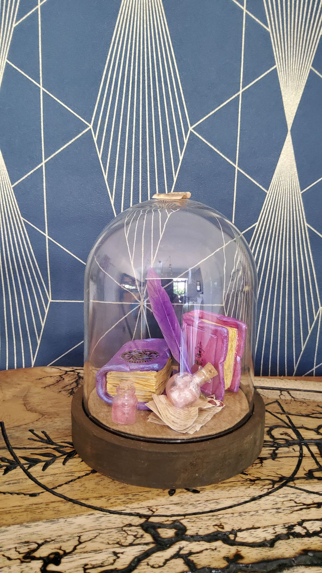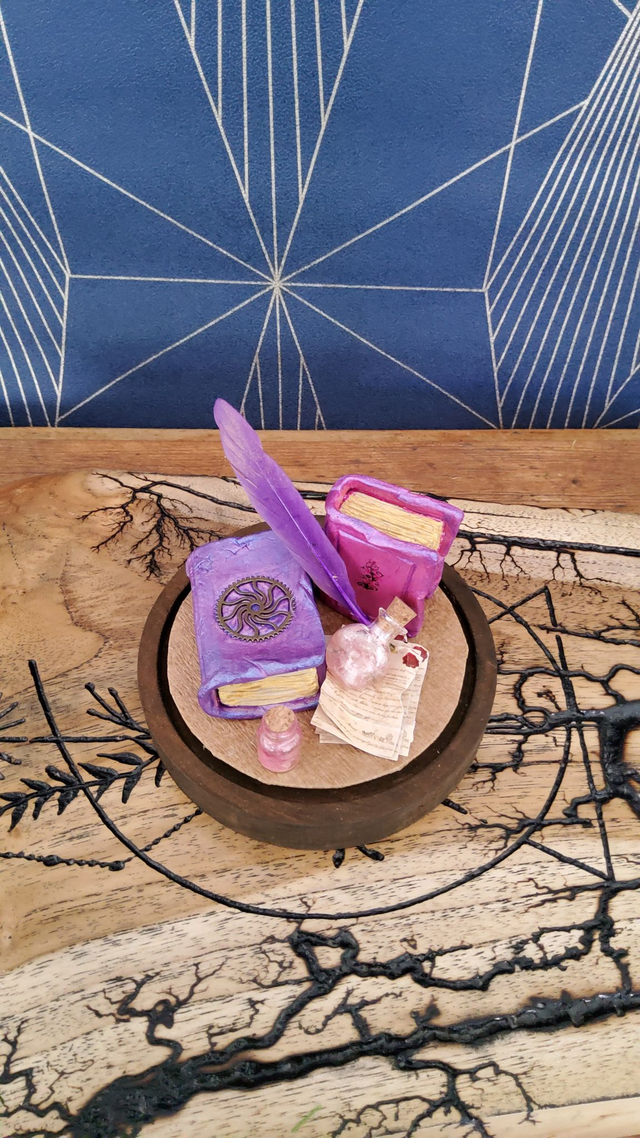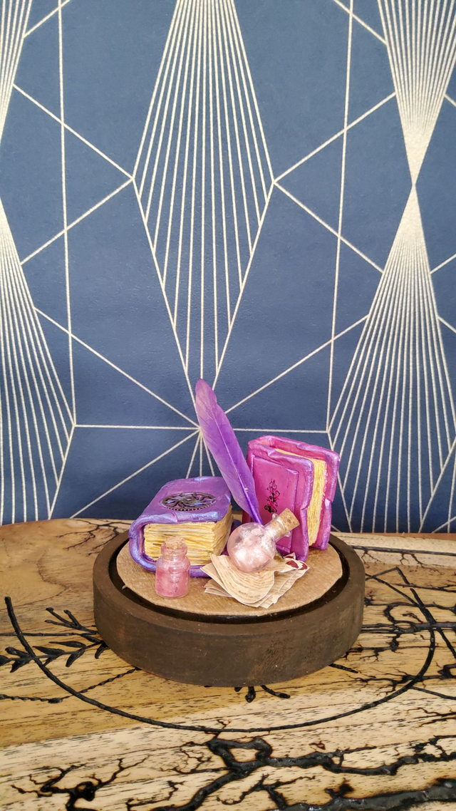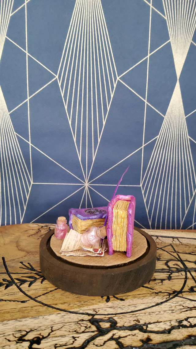Les grimoires est sculpté à la main en pâte polymère, d'abord cuites avant d'être peintes et installées dans un décor.